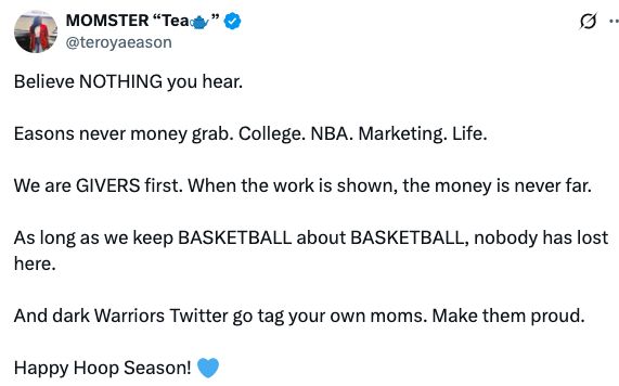 随后伊森妈妈也是更新动态,写道:不要轻易轻信任何流言。伊森从不唯利是图,无论大学联赛、NBA、商业市场还是人生舞台。我们首先是付出者。只要努力到位,金钱自然不会遥远。只要我们始终让篮球回归篮球,就没人会输。
