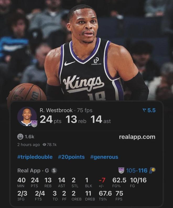 今夏休赛期以无保障老将底薪合同加盟国王的威少,打出了一个性价比超高的赛季,至今亮相27场比赛首发21次,场均上阵29分钟,贡献14分6.7板7.4助1.3断全面数据,场均以35.9%命中率扔进1.7记三分球,三分命中率为生涯新高。