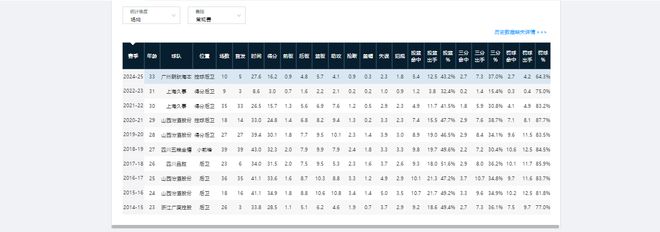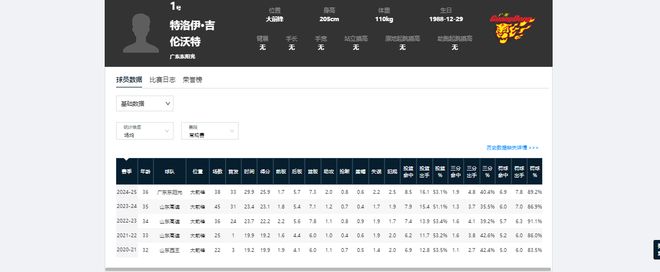 他的生涯最高光时刻是在24-25赛季效力广东队期间,常规赛场均数据为25.9分7.3篮板2助攻。